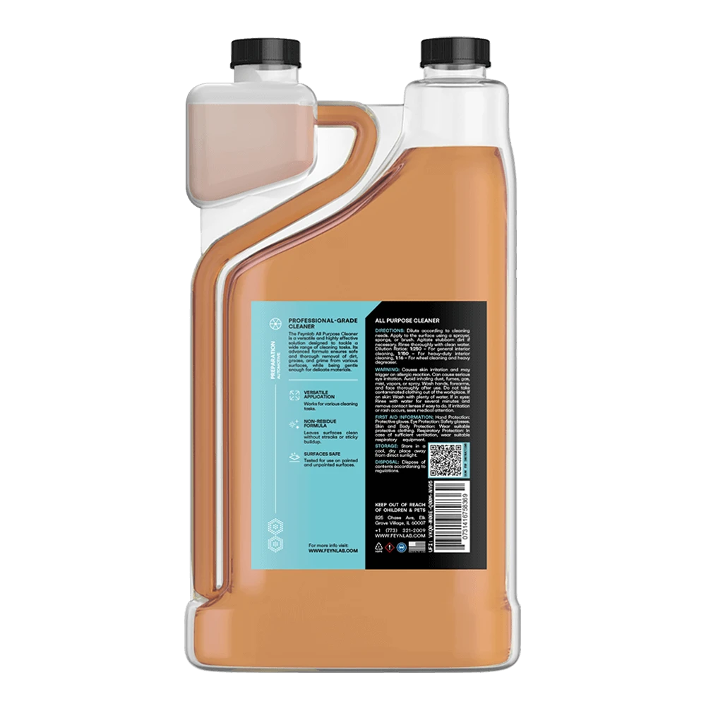Feynlab All Purpose Cleaner to uniwersalny preparat czyszczący. Regulowana moc przez rozcieńczanie (1:3 do 1:10). Do tapicerek, plastików, silników, progów. Bezpieczny dla powłok ceramicznych.